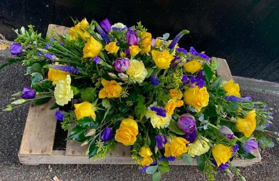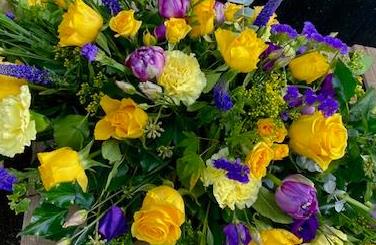 Beautiful bright yellow and blue  spray, check for seasonal availability