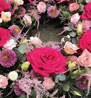 Stunning wreath made with beautiful garden style roses fresh rosemary and spray roses