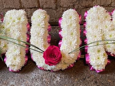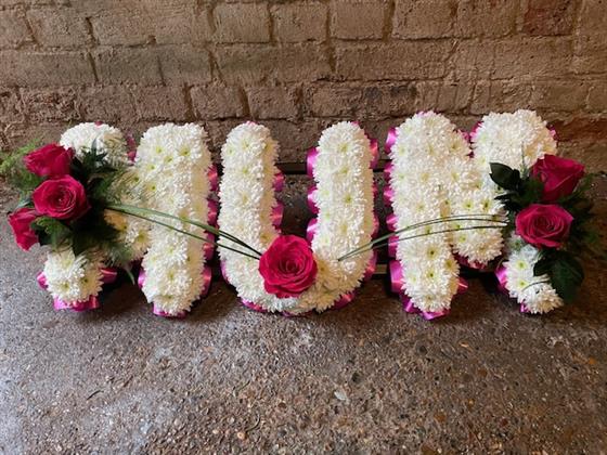 Mum based in white with Pink ribbon edge and sprays, other colours of ribbon and sprays can be requested at your choice