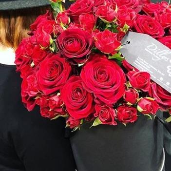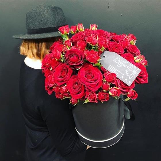 A beautiful tied bouquet of red roses delivered in a hatbox!