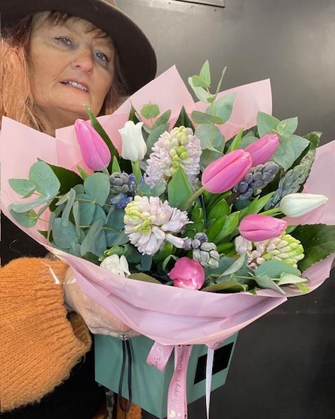 Simpley gorgeous mix of hyacinths tulips and mixed foliages hand tied in water The perfect spring box
