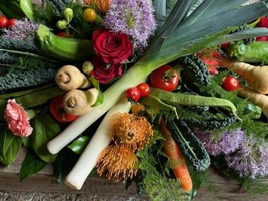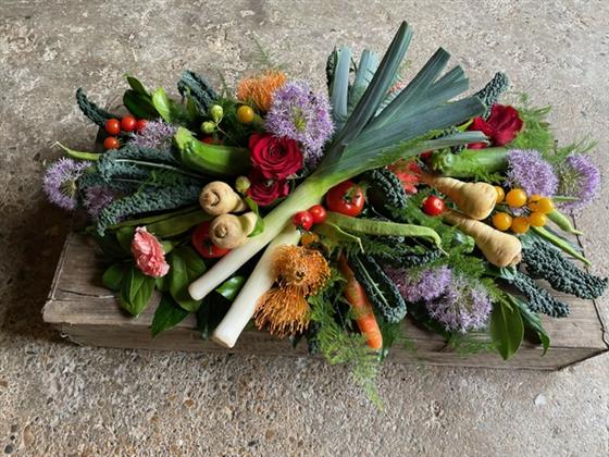 Stunning spray made of vegetables and flowers , fitting tribute for any gardener