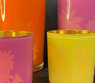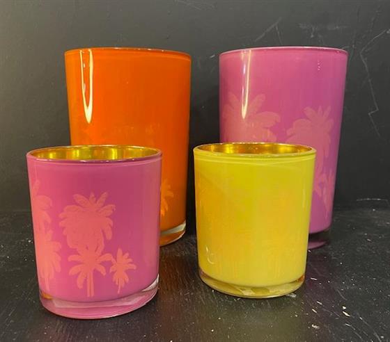 Citrus orange pinks and yellow tealight holders etched with tropical gold palm leaf design.