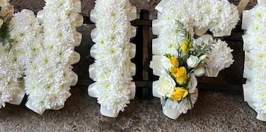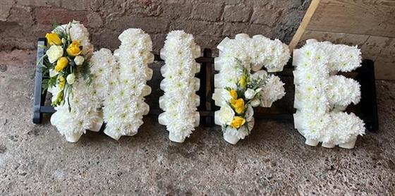 Based wife tribute in white with yellow and white sprays and white ribboning