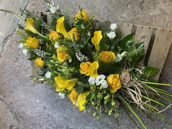 Pretty yellow and white sheaf made in oasis to look like its tied