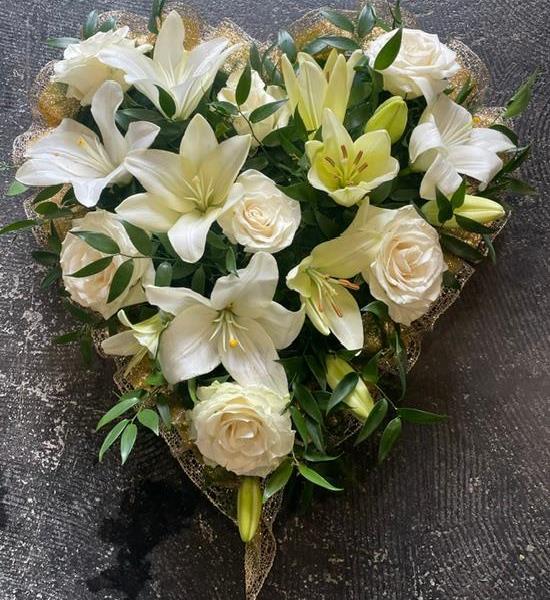 Purity and sentimental Heart tribute made with open white lilies and roses , please note two weeks notice advised for this tribute